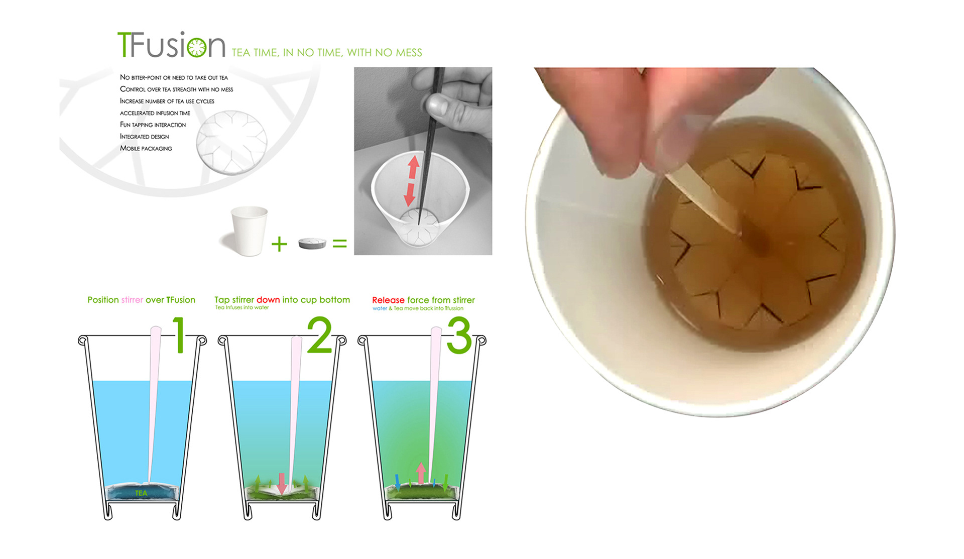 The TFusion was created after much frustration with tea bags which create a mess when you pull them out to keep tea from getting bitter. The bags would also block the lid opening or float in the way of my lips when drinking straight from the cup. My design keeps the tea at the bottom via a paper diaphragm that is swaged into a cup. Functional cut patterns and screening allow tea to be infused by simply tapping on it. Tfusion allows for control over strength, speed of infusion, and keeps the bitterness contained at the bottom of the cup.